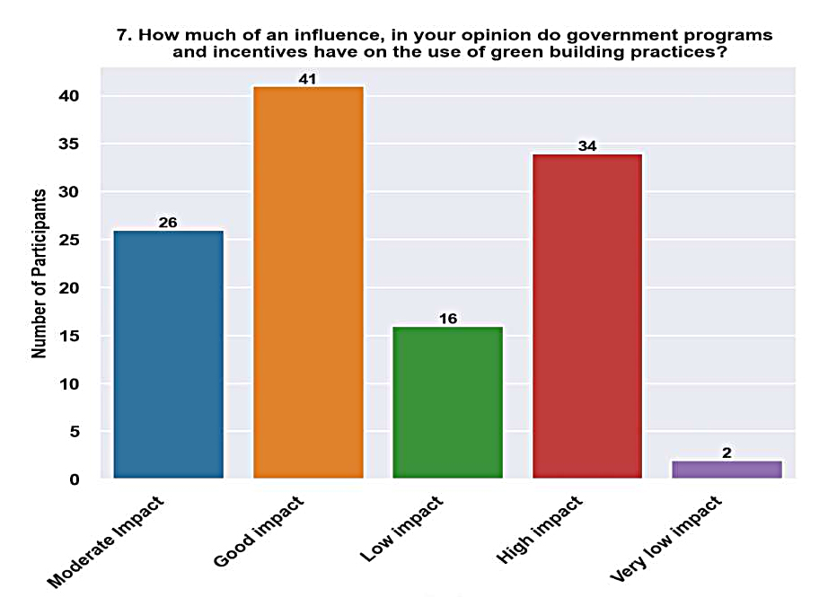 Moderate Impact (22%). The proportion of respondents who said that there was a moderate influence points to differing opinions about how well government incentives and programs work to promote green construction techniques. Stakeholders may identify gaps in implementation or areas for development that prevent the full realization of sustainability objectives, even when they understand the significance of government actions.