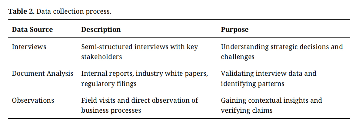 To ensure a comprehensive understanding of the case research subject, a multi-method approach can be employed for data collection. This approach enhances the validity and reliability of findings by integrating multiple sources of evidence as shown in Table 2.