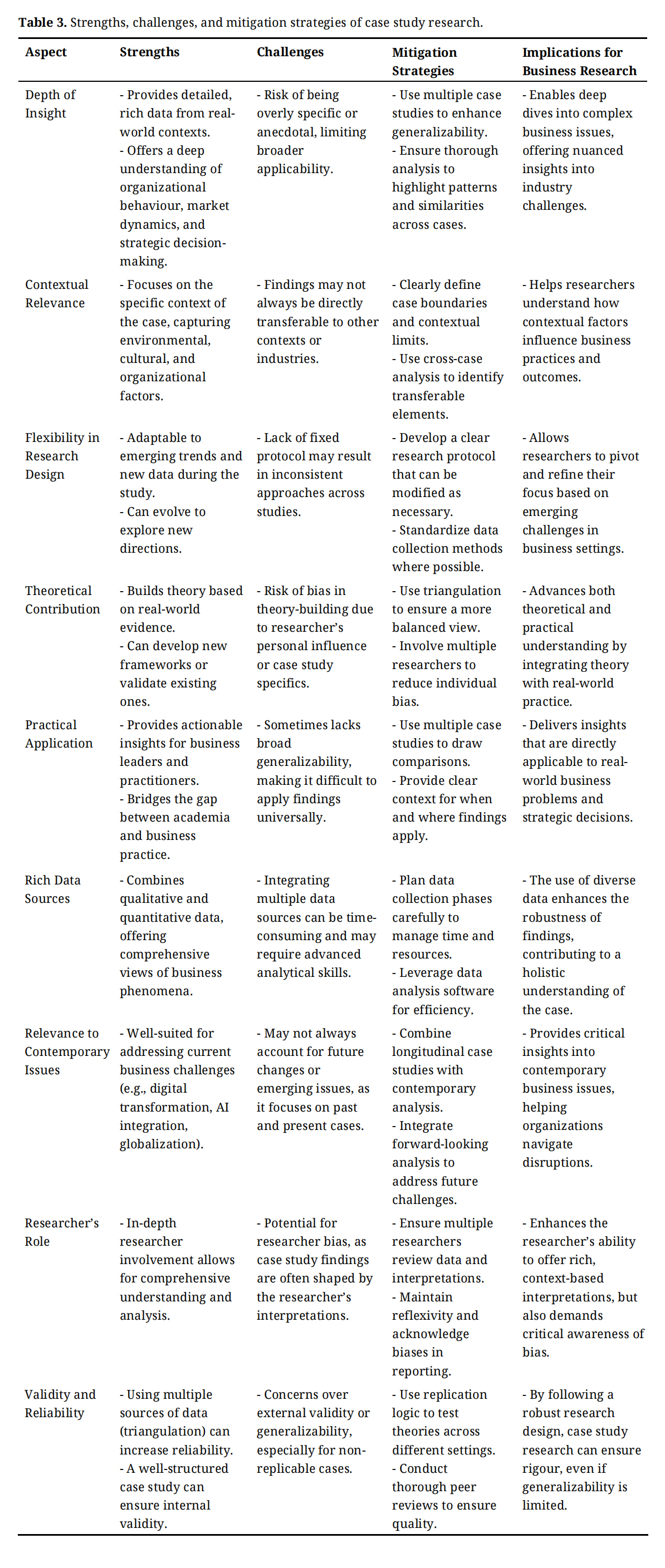 Table 3 provides a comprehensive overview of the strengths and challenges associated with case study research in business contexts, along with mitigation strategies designed to address the identified challenges. It serves as a guide for business researchers, offering practical solutions to enhance the rigour, relevance, and reliability of case study methods. By outlining how case study research can provide deep insights into complex business phenomena while acknowledging potential limitations, the table underscores how careful planning, and methodological rigour can maximize the value of case studies for both theoretical development and practical application in today’s dynamic business environment.