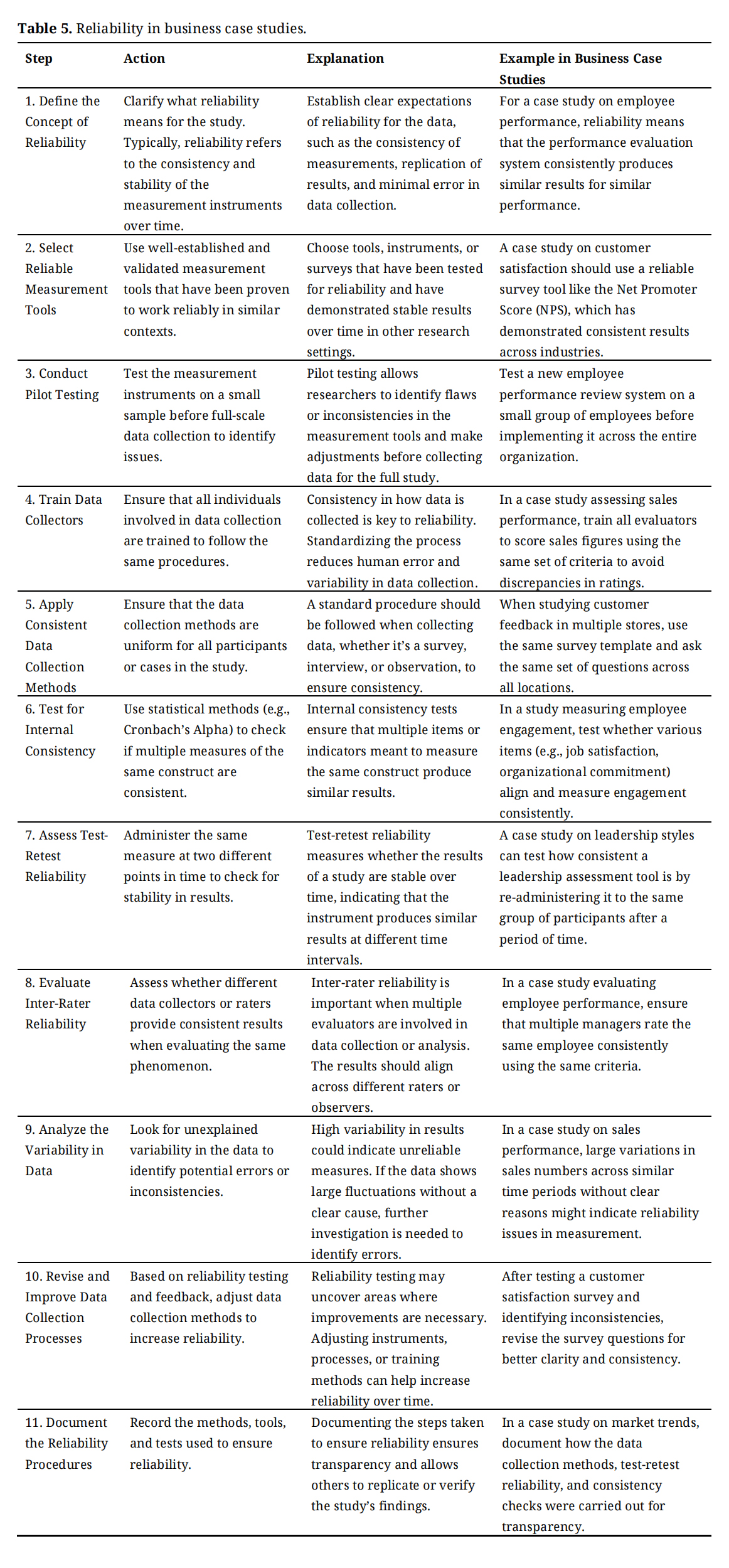 Reliability in Business Case StudiesReliability is crucial for ensuring that research can be replicated with consistent results. In business case study research, reliability is maintained by developing a clear case study protocol and creating a detailed case study database. The protocol includes step-by-step guidelines for data collection and analysis, ensuring that future researchers can follow the same procedures and achieve similar outcomes. This is particularly important in business research, where organisations often operate in fast-moving environments with significant external pressures. By establishing a protocol for how these data sources are collected, analysed and triangulated, researchers can ensure that their findings are not the result of idiosyncratic interpretations but are based on systematic, repeatable processes. Reliability in business case studies refers to the consistency and stability of the measurements used in the research. To ensure reliability, researchers must first define what it means for their study, such as ensuring that the measurement tools produce consistent results over time and across different evaluators. They should then select well-established, reliable tools and conduct pilot testing to identify any potential issues before full-scale data collection. Training data collectors, applying consistent data collection methods and testing for internal consistency are key steps to avoid errors. Researchers should also assess test-retest reliability to ensure stability over time and inter-rater reliability to ensure consistency among different evaluators. Analysing data variability helps identify any inconsistencies, and refining data collection processes based on these findings improves reliability. Documenting all steps and procedures ensures transparency, allowing for replication and strengthening the reliability of the study’s results. Following these guidelines ensures that the business case study produces consistent, dependable, and replicable findings as shown in Table 5. Table 5 outlines the essential steps to ensure reliability in business case studies, focusing on maintaining consistency and accuracy in data collection.