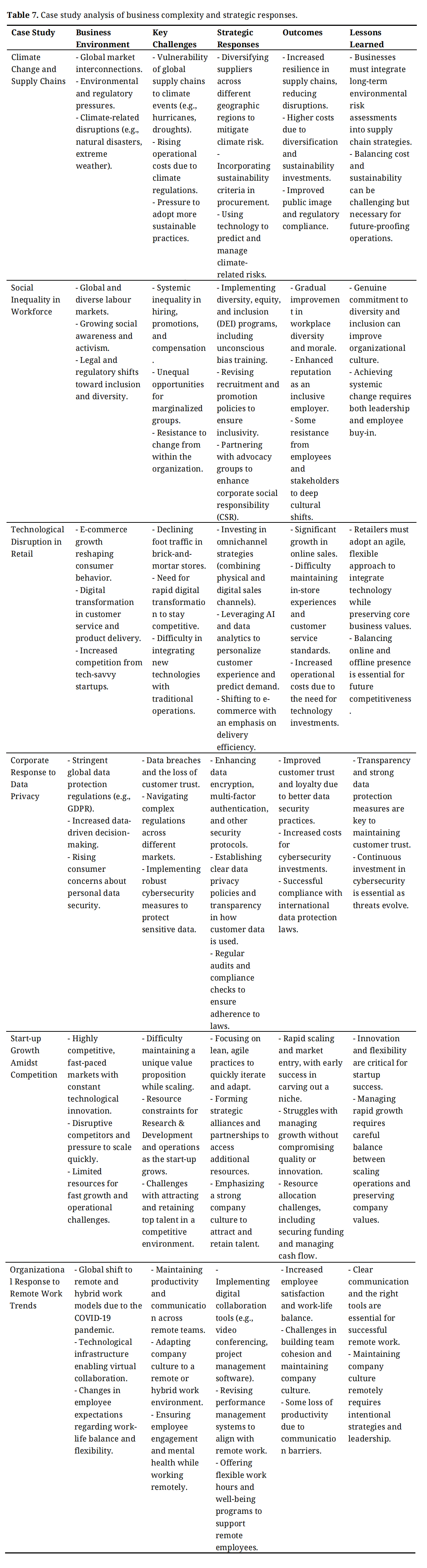 With the increasing volume of data being generated and utilized by businesses, the issue of data privacy has become one of paramount concern. Stringent global data protection regulations, such as the General Data Protection Regulation (GDPR), have forced companies to adopt stronger cybersecurity measures. To maintain customer trust and ensure compliance, organizations have enhanced their data security protocols, including the use of encryption, multi-factor authentication, and regular compliance checks. While these measures have contributed to improved customer trust, they have also increased the cost of doing business due to the need for continual investment in cybersecurity infrastructure. The key lesson here is that transparency and robust data protection practices are essential for maintaining long-term customer loyalty [65]. Start-ups often operate in fast-paced markets where innovation and the ability to scale quickly are critical to success. However, the pressure to grow rapidly and compete with disruptive competitors can pose significant challenges. Many start-ups focus on lean, agile practices, strategic partnerships, and cultivating a strong company culture to attract and retain talent. Despite these efforts, the challenges of managing growth without compromising on quality or innovation are pervasive. Securing funding, managing cash flow, and scaling operations while maintaining the original value proposition remain critical hurdles. The lessons drawn from start-up case studies emphasize the importance of flexibility, innovation, and careful resource management to successfully navigate the complexities of scaling a business [97]. The COVID-19 pandemic has reshaped the way businesses approach work, with a significant shift towards remote and hybrid work models. Organizations have faced challenges in maintaining productivity, ensuring effective communication, and adapting their company culture to a virtual environment. Many have implemented digital collaboration tools and revised performance management systems to support remote work. While these strategies have improved employee satisfaction and work-life balance, challenges such as maintaining team cohesion and preventing communication barriers persist. Businesses have learned that clear communication, the right tools, and intentional strategies are essential for the success of remote work models [98]. Case study research provides valuable insights into the strategic responses’ businesses adopt to navigate complex challenges. From addressing climate change risks to responding to technological disruptions, organizations must continually adapt to external pressures and changing market dynamics. The lessons learned from these case studies highlight the importance of strategic flexibility, sustainability, innovation, and leadership in driving long-term success. By exploring these real-world scenarios, businesses can gain practical insights that inform both theory and practice, offering valuable guidance for practitioners navigating the evolving global business landscape as shown in Table 7.