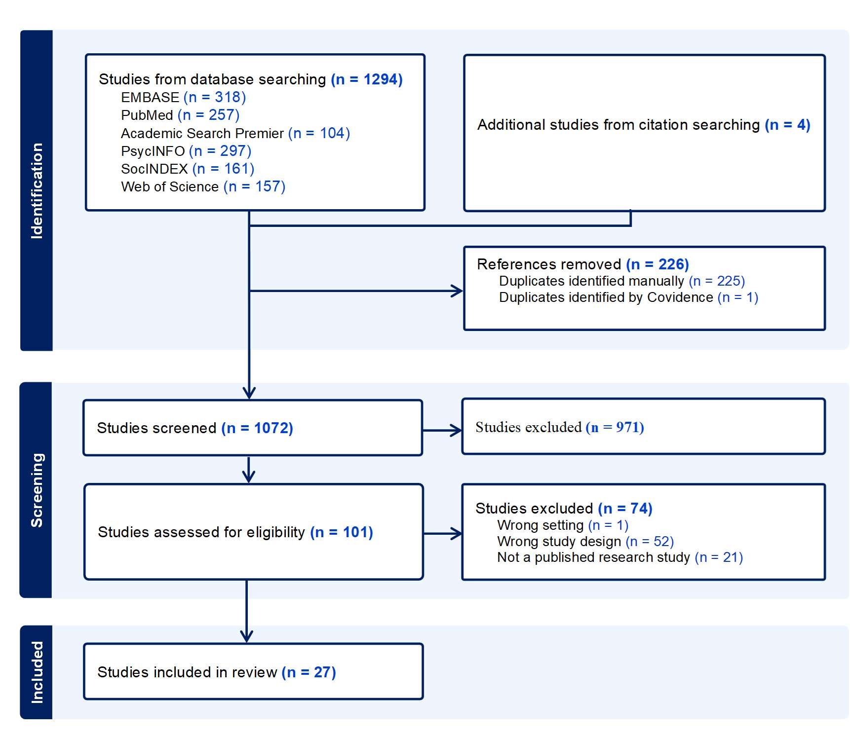 This scoping review involved a comprehensive literature search spanning six databases: PubMed, EMBASE.com, Academic Search Premier, PsycINFO, ScoINDEX, and Web of Science. We identified four relevant articles during preliminary investigations, which were used to fine-tune our search strategy and validate the accuracy of our search terms. These articles served as benchmarks to confirm the relevance of the results obtained through our searches. Our literature search was conducted in December 2023. Each database was searched using three key categories: