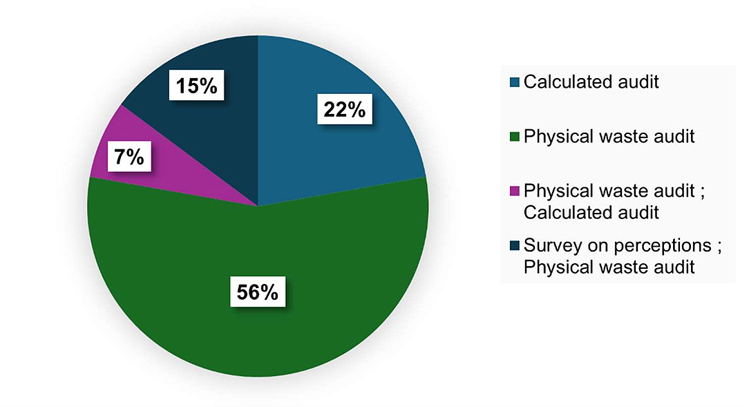 The studies included in the review were published between 2009 and 2023, with a noticeable increase in publications in 2021, followed by a decline in 2022, and increase again in 2023. (It is possible that COVID-19 school closures and a move to online learning impacted research on this topic.) Participant recruitment for perception-based surveys was predominantly conducted via mall intercept surveys. The most frequently utilized data collection method across studies was physical waste audits (56%), followed by calculated audits (22%), survey on perceptions and a physical waste audit (15%), and both a physical and calculated waste audit (7%) (Figure 2). Environmental interventions emerged as the most common type of intervention tested, followed by passive education programs, combined interventions, engaged education programs, and least common, incentive-based interventions (Figure 3).