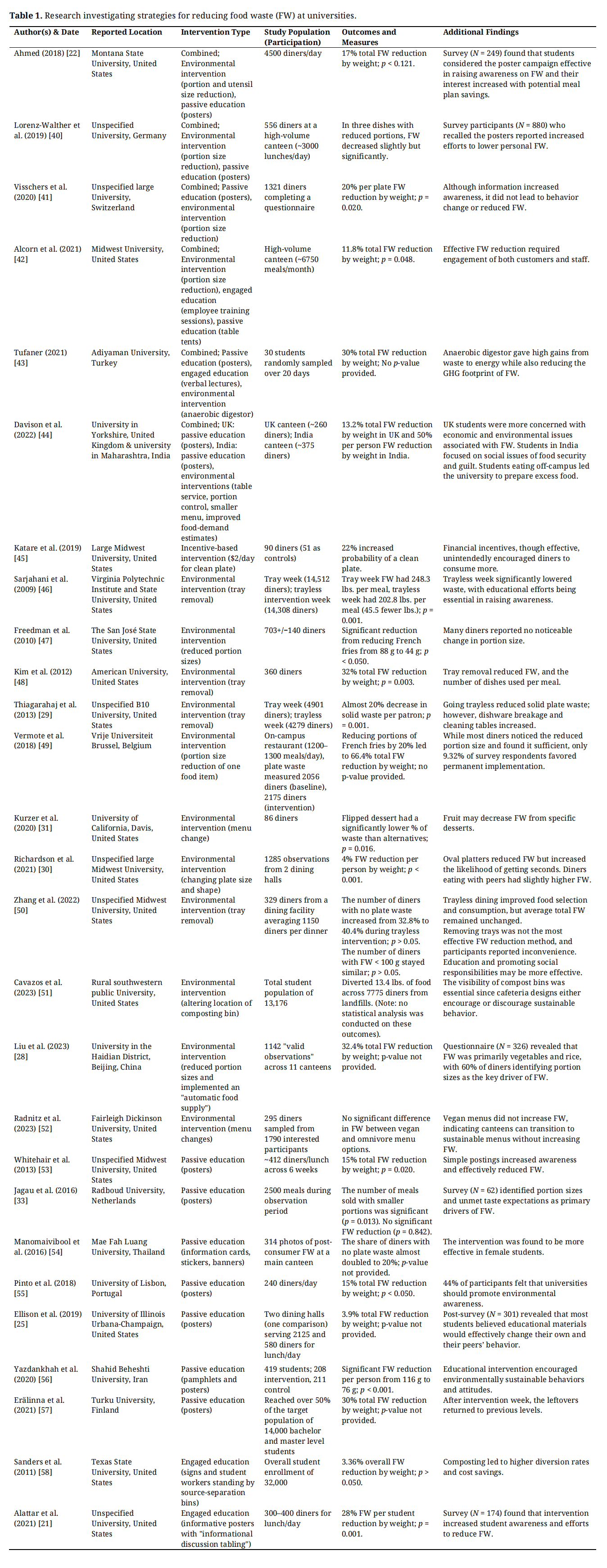 This scoping review has potential limitations. The majority of studies in this review were conducted in the U.S. and Western Europe, likely limiting the global applicability of our findings. This regional concentration may in part reflect the geographical variability in the use and existence of university dining facilities. In contexts where university canteens are less popular or structured differently, FW interventions may not be possible on campus and/or a research interest and the applicability of certain interventions strategies may be minimal. Although our literature search strategy aimed to be comprehensive, it was restricted to English-only studies across six databases and may have missed some relevant publications. We excluded observational studies, narrative reviews, and non-original research that could have offered additional insight. With only 27 studies, all having unique methods, demographics, and interventions, direct comparison across studies was difficult. Lack of consistent results and robust data makes it challenging to make conclusive statements about the efficacy of the FW interventions included here. Additionally, there are numerous FW reduction strategies that were not captured in this review. For example, limiting back of house FW (from kitchen processing and procurement) as well as impact of landfill diversion strategies, such as traditional composting (windrow or other aerobic methods), industrial composting, use of biodigesters, vermicompost, or composting using other insects (such as the black soldier fly) were not included. These interventions and strategies are worthy of consideration given the breadth and scope of FW. Some, such as composting FW, also involve consumer behavior and could be impacted by the interventions described above. Future research should investigate additional FW reduction strategies.