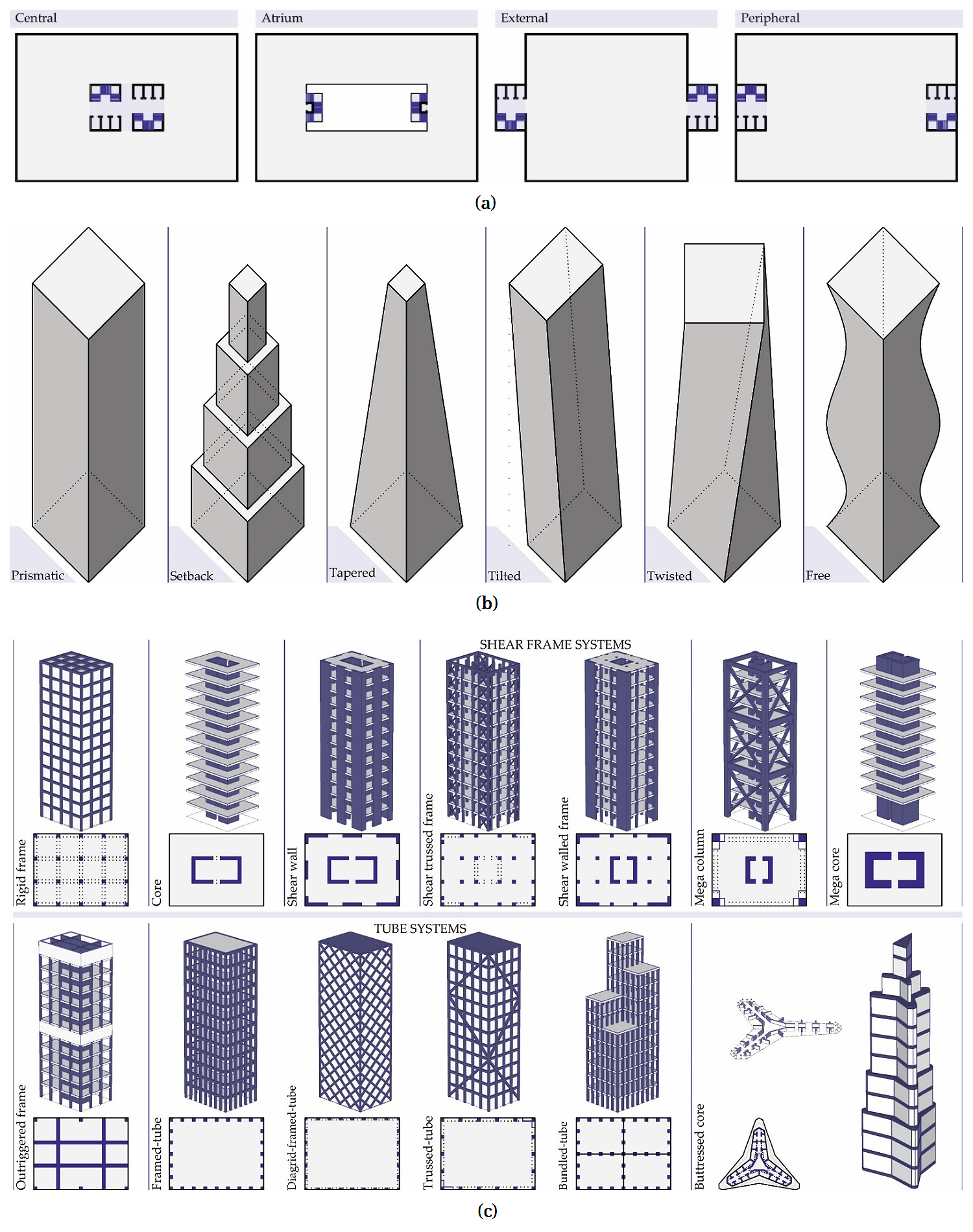 The design of skyscrapers is guided by both architectural and structural requirements, where essential elements include core layout, building function and form, and the selection of structural systems and materials. For architectural considerations, this study adopts the core layout framework from [24], as illustrated in Figure 2a. Additionally, this paper classifies building forms into various distinct categories, shown in Figure 2b. Selecting an appropriate structural framework is crucial for skyscraper design. This article applies the structural classification presented by [38], depicted in Figure 2c. The choice of structural materials, such as steel, concrete, or composite systems, plays a critical role in defining component dimensions and spatial arrangement. In this context, the term ‘composite’ denotes skyscrapers where vertical load-bearing elements, including shear walls and columns, are constructed from combinations of concrete and steel.