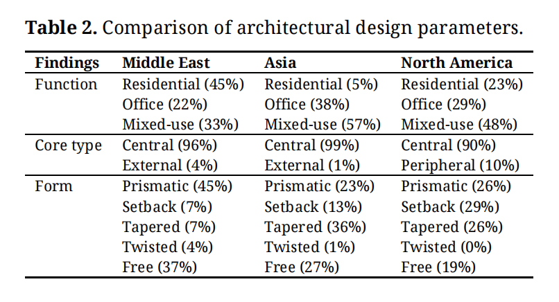 This section presents a comprehensive quantitative analysis of architectural design parameters for a total of 133 skyscrapers in the Middle East (27 towers), Asia (75 towers), and North America (31 towers). The methodology involved multiplying the percentage values in Table 2 by the number of buildings in each region to produce the number of towers in each subcategory.