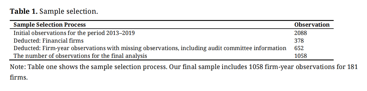 The sample includes all firms listed on the TSE from 2013 to 2019. The study period was set from 2013 to 2019. The year 2013 was selected as the starting point because the TSE issued internal control guidelines that mandated the establishment of audit committees in all listed firms, thereby creating a unified regulatory framework for corporate governance practices in Iran. The year 2019 was chosen as the endpoint, since from 2020 onwards, the outbreak of the COVID-19 pandemic generated extraordinary economic and operational disruptions that could confound the findings. Previous studies have confirmed that the pandemic substantially influenced firm performance and governance both globally [85,86] and in the Iranian capital market [87]. Therefore, focusing on the period 2013–2019 ensures the reliability and comparability of the data within a stable institutional and economic context. All the necessary information for this research was manually extracted from the comprehensive database of the Iran Securities Exchange Organization (CODAL) (CODAL is the official platform for the disclosure of information by companies listed on the TSE. All data on this platform are freely accessible to the public, including academic researchers, and are not subject to copyright restrictions.). Specifically, data related to the audit committee was collected from the comprehensive audit committee reports available in CODAL. Information regarding the board of directors, ownership structure, firm age, and other research variables was obtained from the board of directors’ reports and financial statements in the database. Firm-year observations related to financial firms were excluded due to their distinct internal control procedures [40,88] and differences in corporate governance regulations [24]. Additionally, firms and firm-years with missing data required for model estimation were removed. As a result, the final sample consisted of 1058 firm-year observations for 181 firms. The sampling method is described in Table 1.