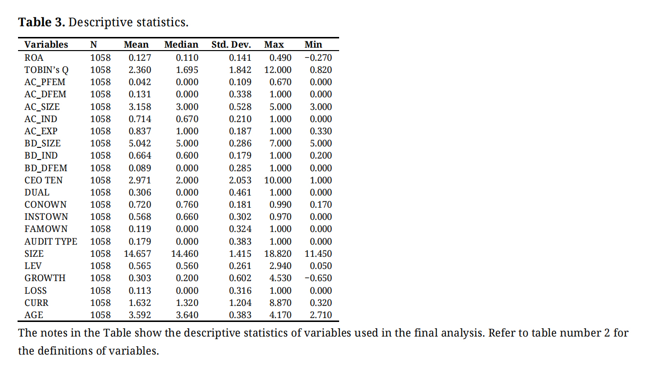 Performanc e it = β 0 + β 1 AC_FE M it + β 2 AC_SIZ E it + β 3 AC_IN D it + β 4 AC_EX P it + β 5 BD_SIZ E it + β 6 BD_IN D it + β 7 BD_PFE M it + β 8 CEOTE N it + β 9 DUA L it + β 10 CONOW N it + β 11 INSTOW N it + β 12 FAMOW N it + β 13 AUDITTIP E it + β 14 SIZ E it + β 15 LE V it + β 16 GROWT H it + β 17 LOS S it + β 18 CUR R it + β 19 AG E it + b j INDUSTRY+ b k YEAR + ε it (1)