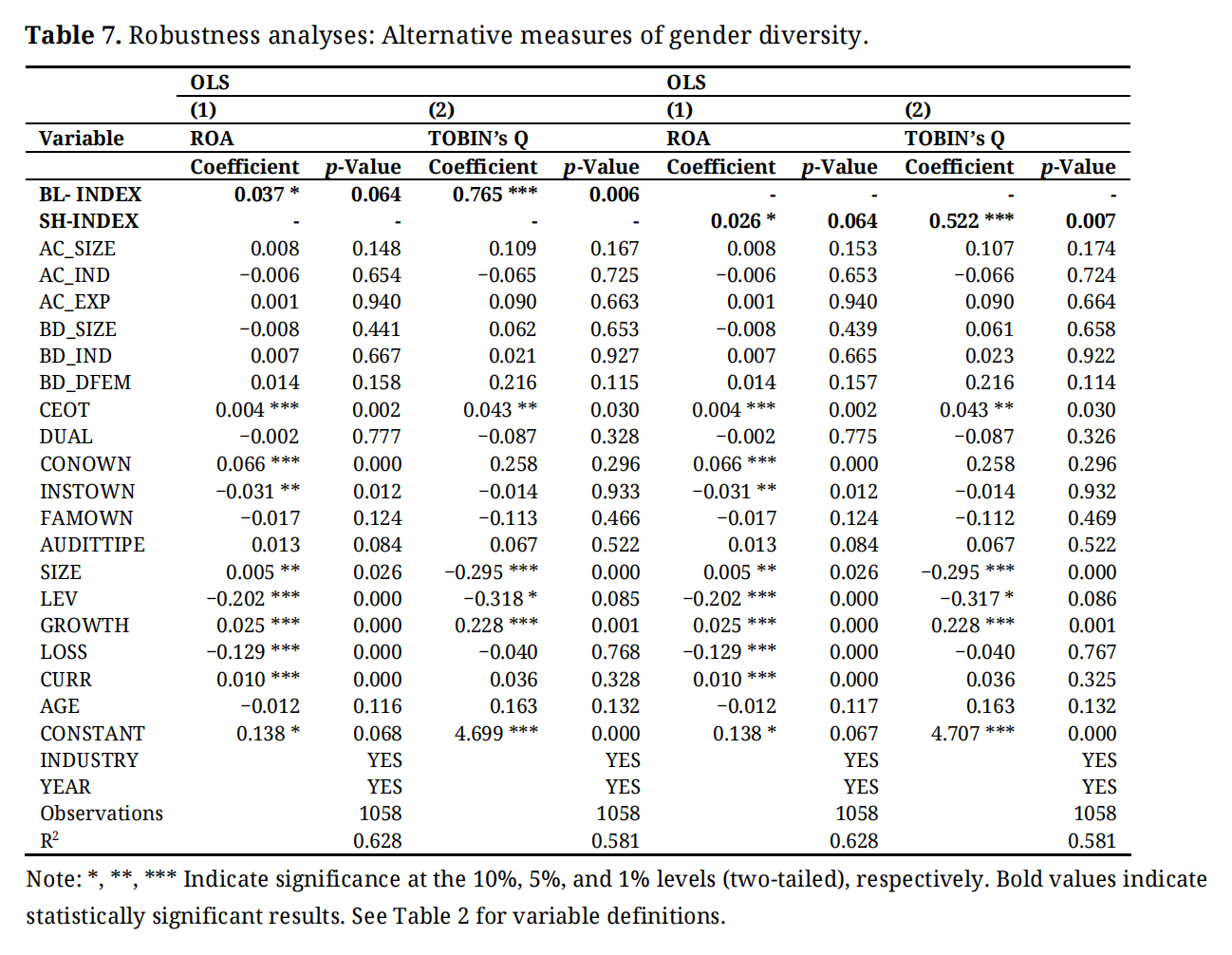 Table 7. Robustness analyses: Alternative measures of gender diversity.