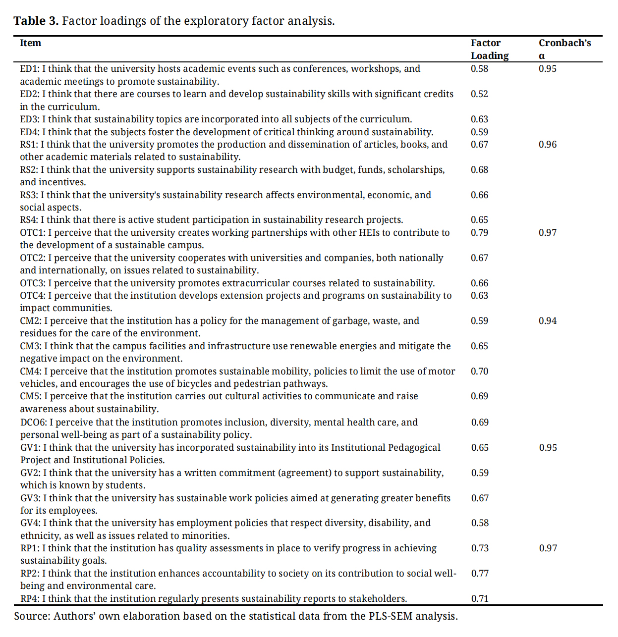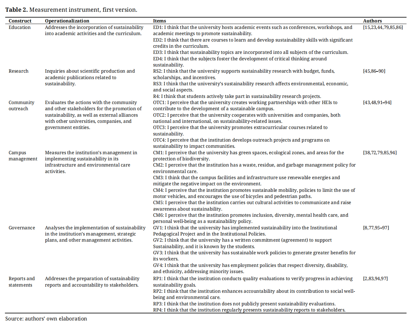 The novelty of this study lies in the creation and validation of an instrument for assessing university sustainability, providing empirical evidence of sustainability management with stakeholders. In this case, it is approached from the student perspective. It becomes a strategic tool for managing sustainability in HEIs in Latin America by shedding light on how the principles of the 2030 Agenda will be achieved.