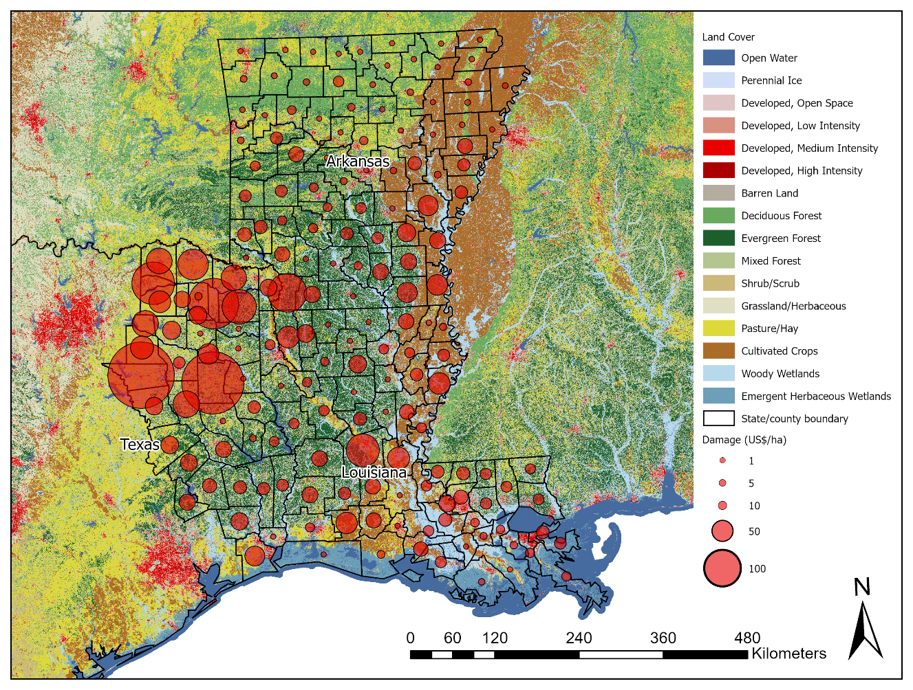 Figure 1. County-level variation in average feral swine damage (US$/ha) across counties in AR, LA, and ETX.