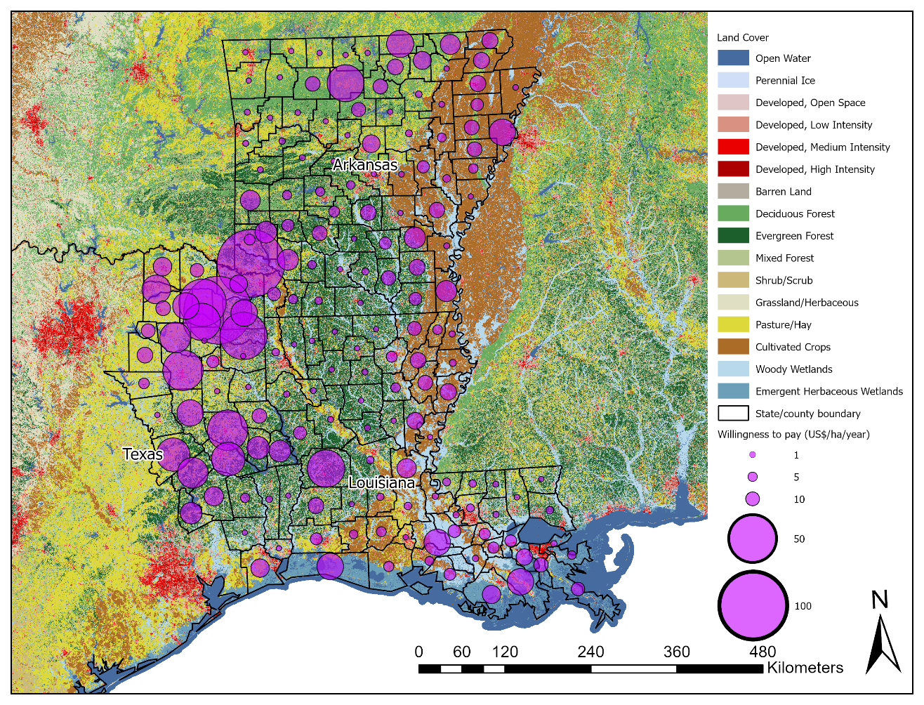 Figure 2. County-level variation in landowners’ WTP for a state-sponsored feral swine control program (US$/ha/year) in AR, LA, and ETX.
