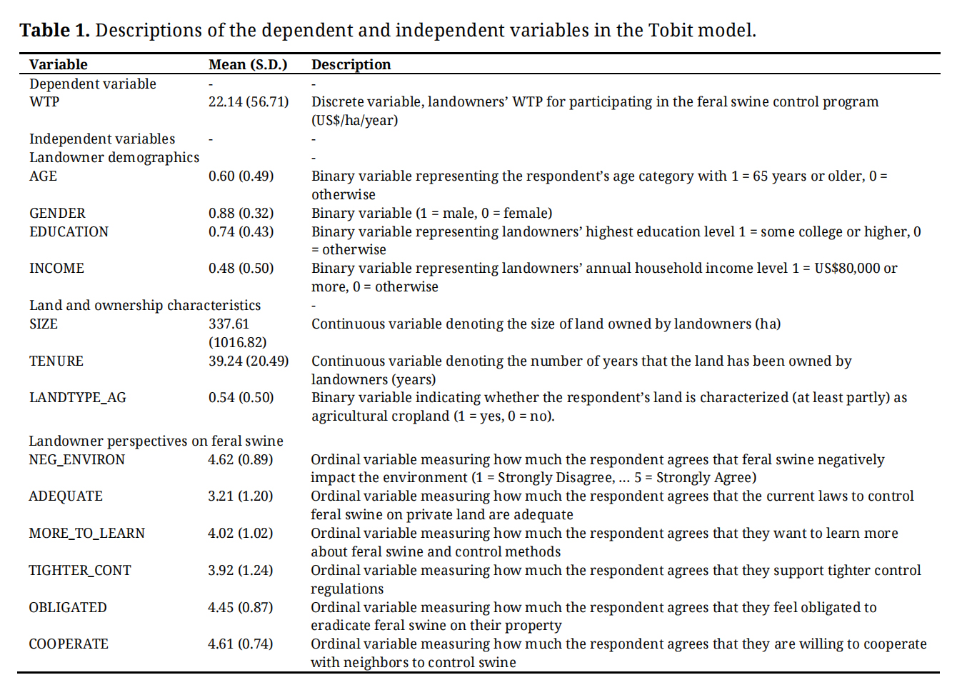 Building on these insights, this study has three objectives. First, we quantify the monetary value that private landowners are willing to contribute to feral swine control programs. Second, we examine how swine-related damages and the corresponding WTP change across different land uses, including cropland, pasture, and forestland. Finally, we use a two-part hurdle model to investigate how WTP is influenced by demographics (e.g., age, gender, income, education), land and ownership characteristics (e.g., land size, tenure, type), landowners’ perspectives (e.g., feral swine’s environmental influence, perceived program effectiveness), experiences (e.g., familiarity, personal experience with the damage) and attitudes (e.g., trust toward neighbors, activeness in community involvement).