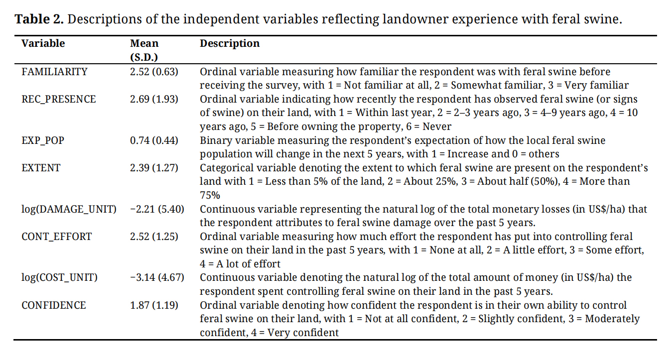 Table 2. Descriptions of the independent variables reflecting landowner experience with feral swine.