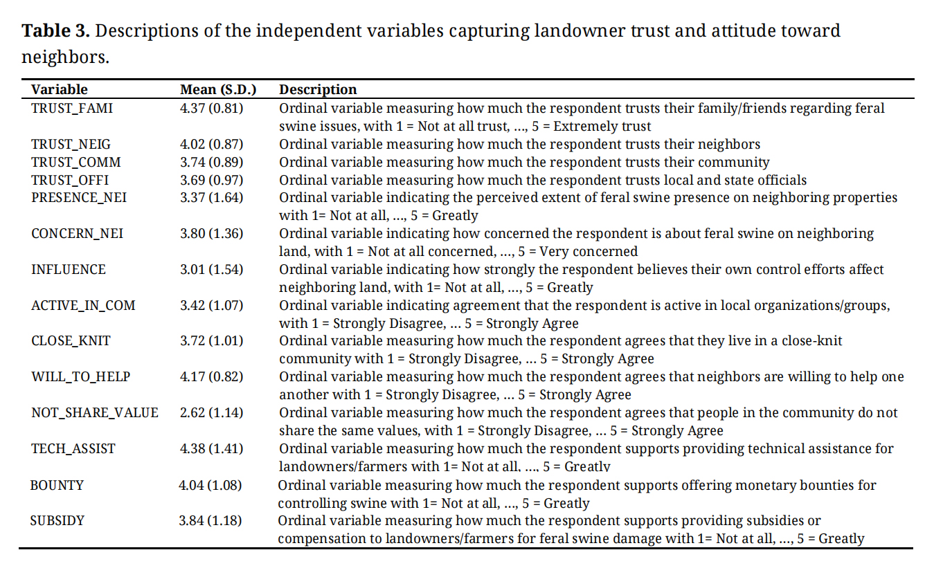 Table 3. Descriptions of the independent variables capturing landowner trust and attitude toward neighbors.