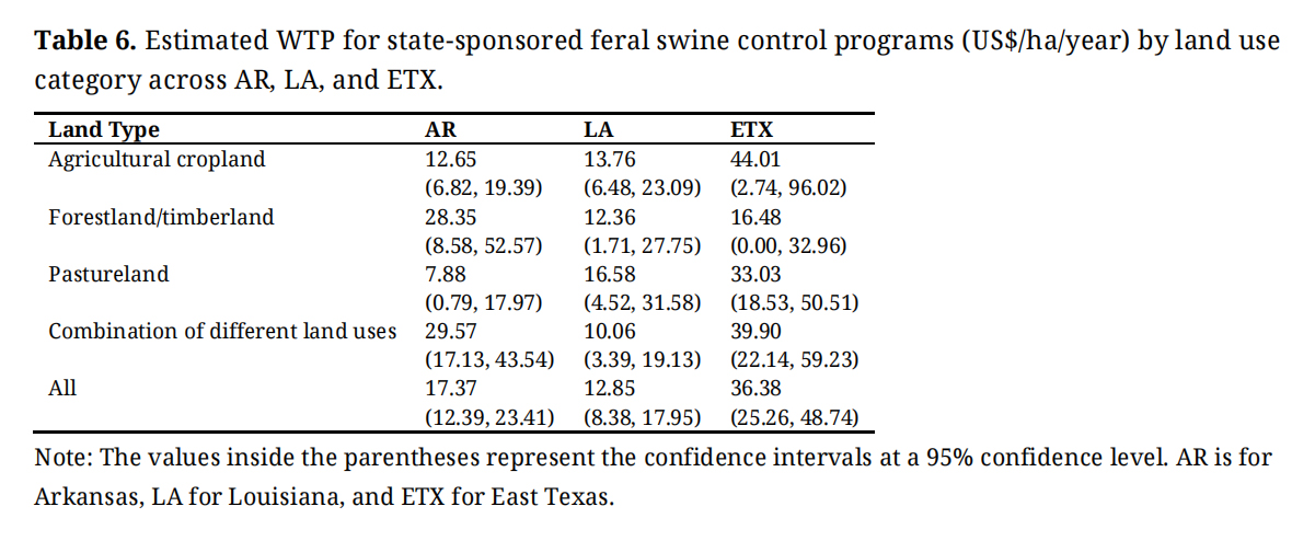 Table 6. Estimated WTP for state-sponsored feral swine control programs (US$/ha/year) by land use category across AR, LA, and ETX.