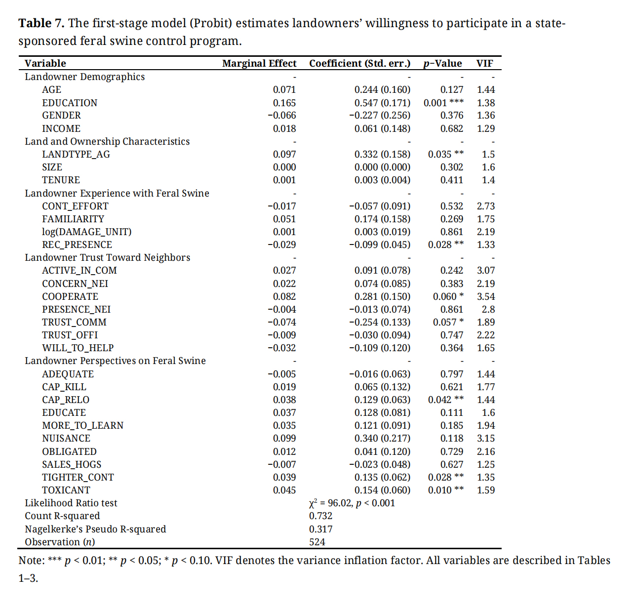 Table 7. The first-stage model (Probit) estimates landowners’ willingness to participate in a state-sponsored feral swine control program.