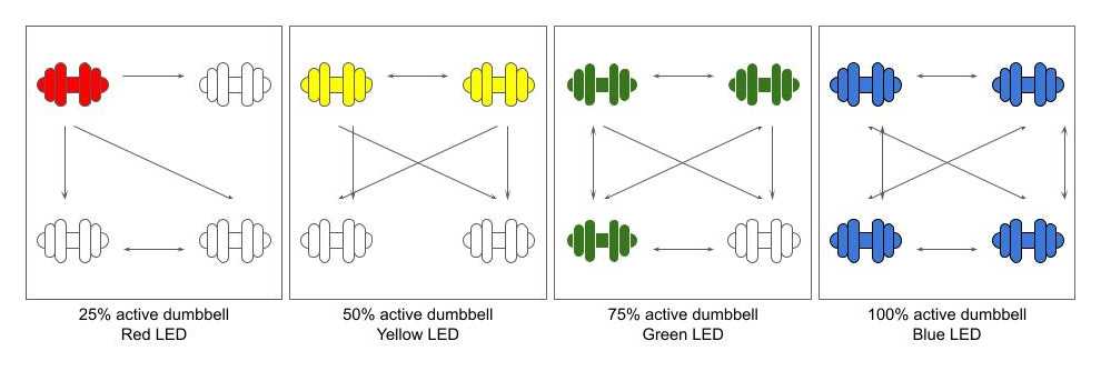The first prototype represents the identification of the demands of older adults who wish to exercise together while also extending the duration of the activity. The shape of the tool is similar to conventional sports equipment used to train hand muscle strength, with an elliptical handle form and a diameter of no more than 43 mm [33]. The complete design prototype weighs one kilogram, as adhere to the majority of the older adult’s talents measured [34]. Embedded technology offered by the prototype is in the form of an invitation to exercise with an arbitrary LED light configuration. Radiant LED lights of different units were switched on in different color to support the need for ‘feeling connected’ among fellow participants. The arrangement of LED color is provided in Figure 2. Before the experiment, participants were instructed on the meaning of the LED color. The motivation to exercise is affected when the lights show a greater number of individuals exercising.