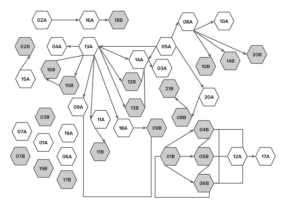Figure 4. Participant’s networking. Code A (white back ground color) were the first group tested; Code B (grey back ground color) were the second group tested.