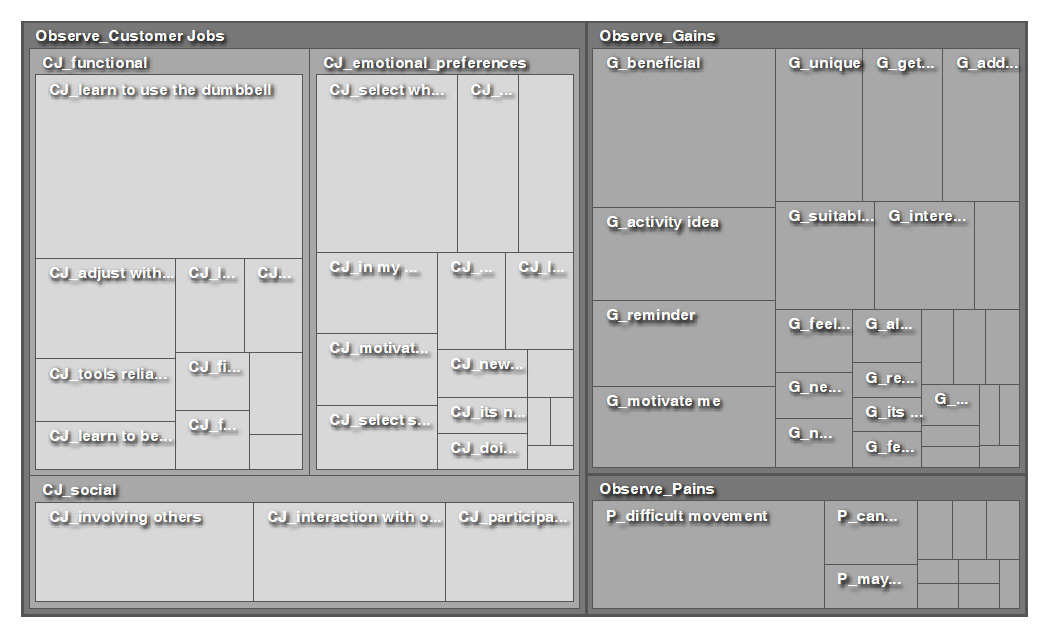 Customer job categories include “learning to use tools” (45 times), “including others” (24 times), “thinking about where to exercise” (23 times), “interacting with others” (21 times), “participating in the community” (14 times), “doing according to one’s own capacity” (13 times), “commitment” (10 times). Participants also reported mixed perceptions of the activity as an opportunity and showed the suitability due to familiarity. Meanwhile, others expressed negative sentiments such as “this activity is not my priority,” “I prefer other activities,” “I get bored after doing it for a long time,” and “I tend to get distracted by other tasks while exercising. Total expression related to customer jobs answers consisted of 249 expressions.