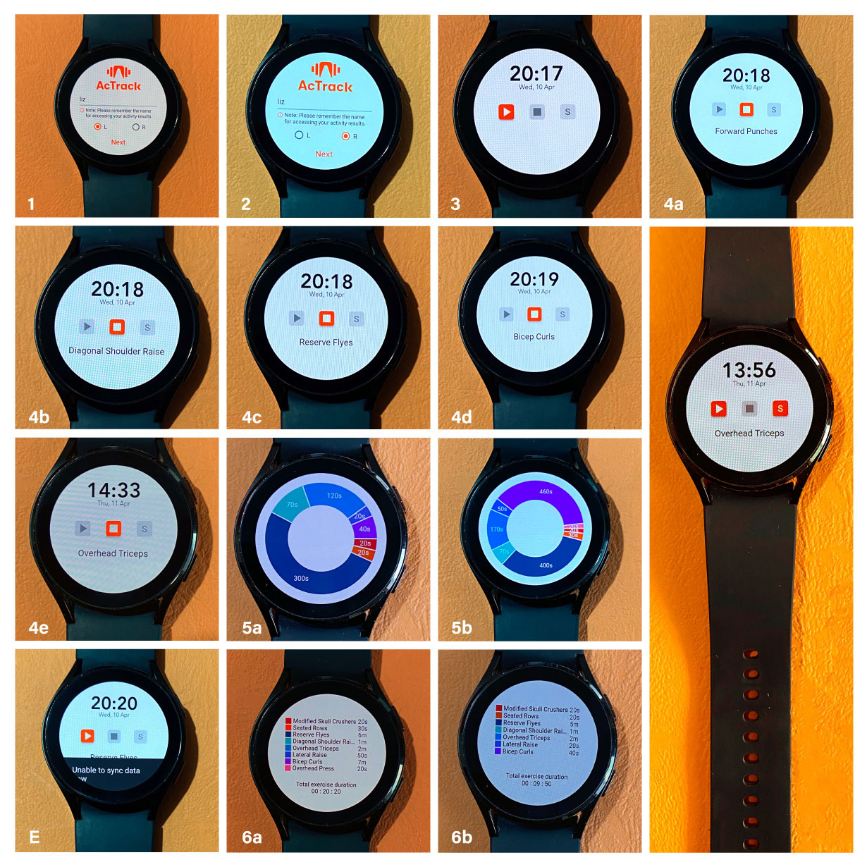 Figure 7. The prototype of AcTrack v.01 as the result of reformulating VP. (1,2) input identification of user and left/right hand, (3) start button active, (4a–e) detecting current motions, (5a,b) pie chart graph for motions performed, (6a,b) cumulative summary type of motions performed with each duration and total duration of exercise each day, and (E) error page once data do not synchronize (no wifi).