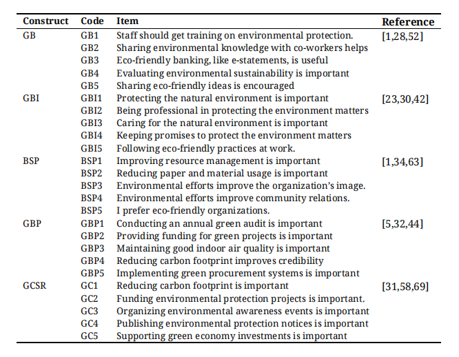 GBPGBP represents the operational efforts of banks to implement environmentally sustainable procedures, such as green financing and paperless transactions [1,32,41]. It was measured using a five-item scale adapted from prior studies. A sample item includes “Allocating financial resources for environmentally sustainable initiatives is essential.” The reliability coefficient (Cronbach’s α) was 0.964.