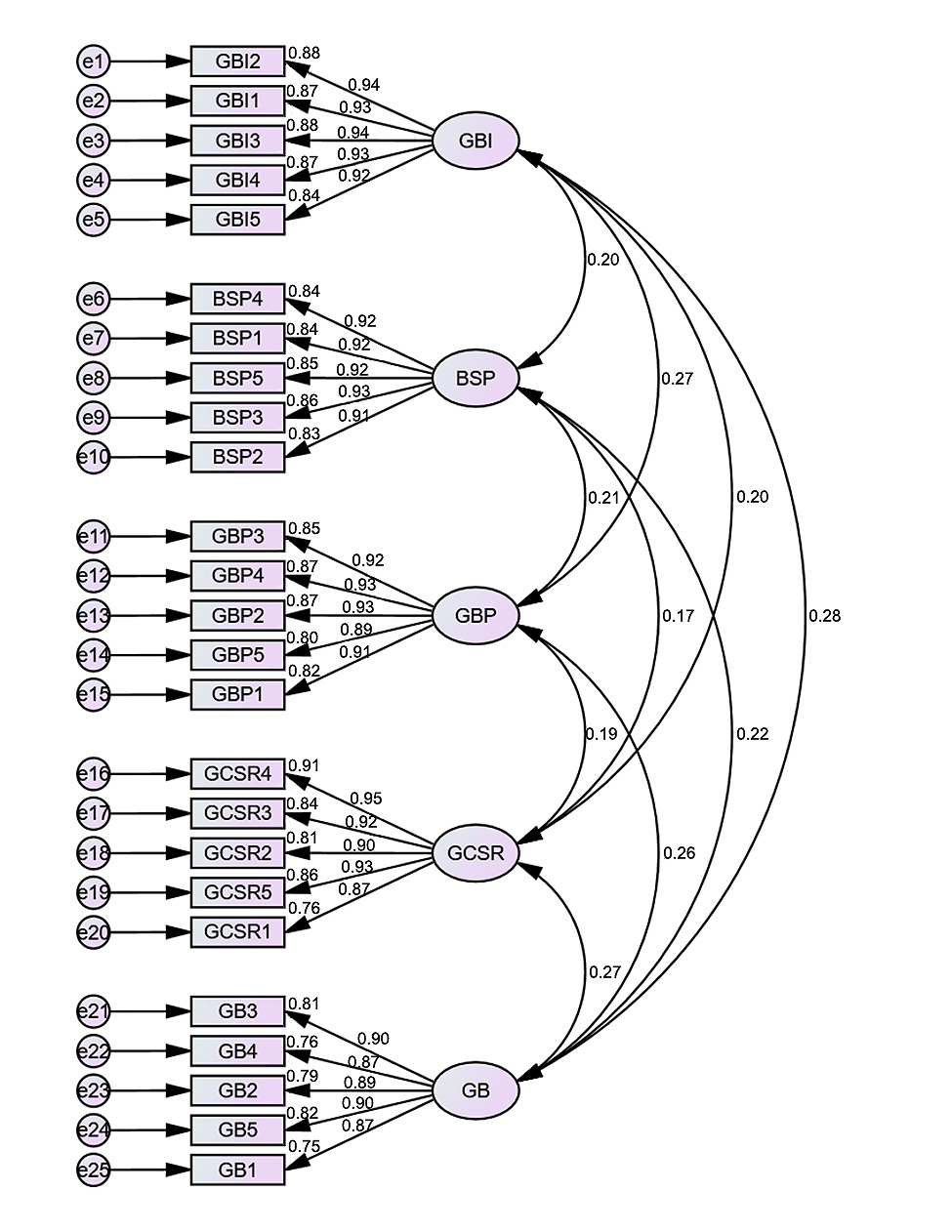 Figure 2. CFA measurement model. (Note: The figure presents the measurement model used to confirm the validity and reliability of the constructs (GB, GBI, GBP, GCSR, and BSP). The double-headed arrows represent correlations among latent variables. The structural (hypothesis) relationships are tested separately in the subsequent model.)