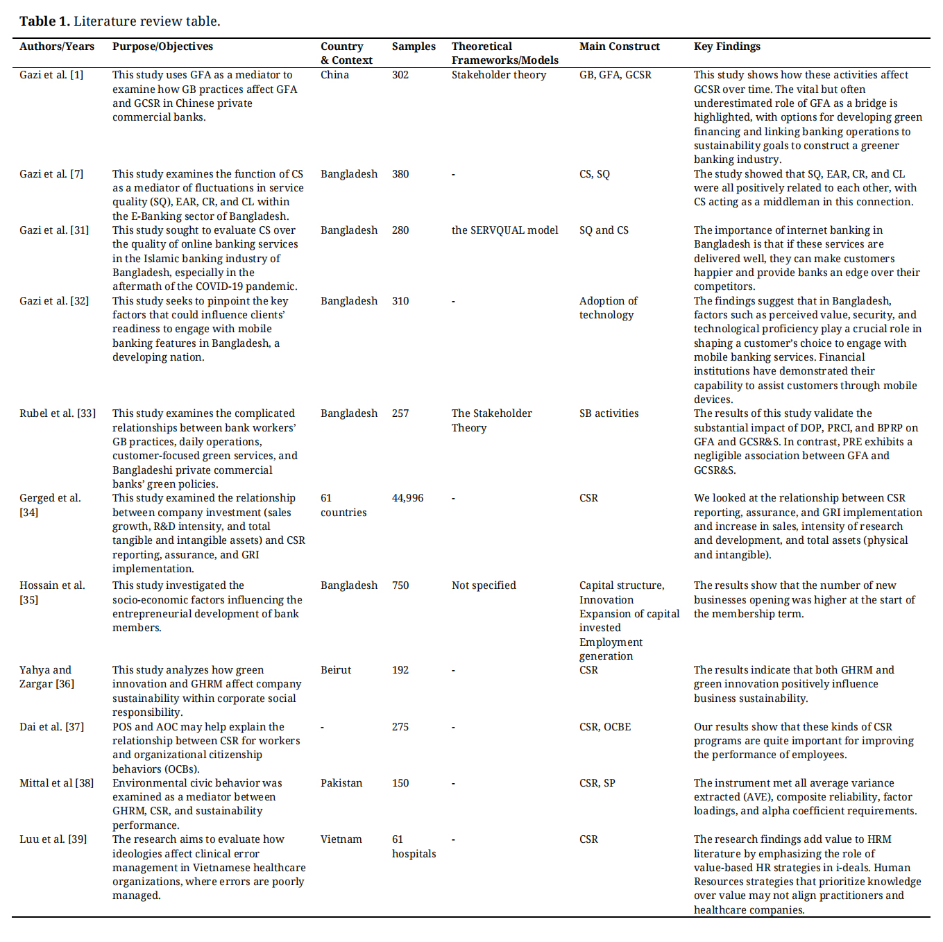 Many studies have been conducted on the issue of Green Banking (GB) and sustainability, but the studies on the joint effect of GB, GBI, and GBP on the SP of banks in Bangladesh are scarce. New studies only cover commercial and private banks and ignore Islamic banks and SOCBs. But the moderating effect of GCSR was less focused in this sector. There is limited empirical evidence on the effect of GCSR on the relationship between greens and sustainability. As a result, there is very limited knowledge about sustainable financing in the case of poor countries like Bangladesh. The gap is evidence of a segmentation between Islamic and state banks that the present paper wishes to bring back together.