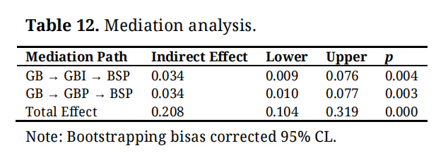 Mediation AnalysisThe mediation analysis, following Baron and Kenny’s [19] approach and bootstrapping (95% CI), revealed that both GBI and GBP significantly mediate the relationship between GB and BSP (Table 12). The indirect effects (GB → GBI → BSP = 0.034, p = 0.004; GB → GBP → BSP = 0.034, p = 0.003) confirm the presence of meaningful mediation. These findings suggest that GB influences sustainability performance both directly and indirectly through innovation and policy development. Thus, internal innovation and structured policy mechanisms act as vital channels through which GB practices enhance SP outcomes.
