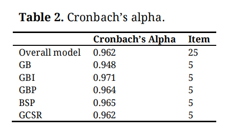 Items ReliabilityThe sample size (n = 420) is appropriate for statistical analysis. The survey’s current driving to categories of GB, GBI, GBP and BSP were examined by Cronbach’s alpha coefficient. the total Cronbach’s alpha of 0.961 obtained by the analysis is very good. Similarly, the internal consistency for all the scales, which was measured by the Cronbach’s alpha coefficient, also indicated that the items were highly consistent and more appropriate for subsequent analyses (Table 2).