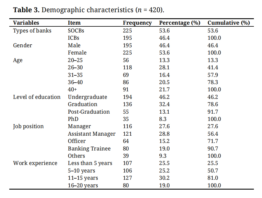 The demographic information of the 420 banking employees in the sample is presented in Table 3. The survey illustrated that SOCBS accounted for 53.6% and ICBs 46.4%. Men accounted for 53.6% and women 43.6%. 13.3% were ≤25 years, 28.1% were 26–30, 16.4% were 31–35, 20.5% were 36–40 years old. At an educational level, 13.1% had postgraduate studies, 32.4% had graduate studies and 8.3% held a PhD. And so, many respondents were assumed to be highly educated. Of the respondents 27.6% were managers, 28.8% assistant managers, 15.2% officers, 19.0% banking trainees and 9.3% others. 25.5% of the researchers worked for less than 5 years, 25.2% for five to 10, 30.2% for 11 to 15 and 19.0% for over 16 years.