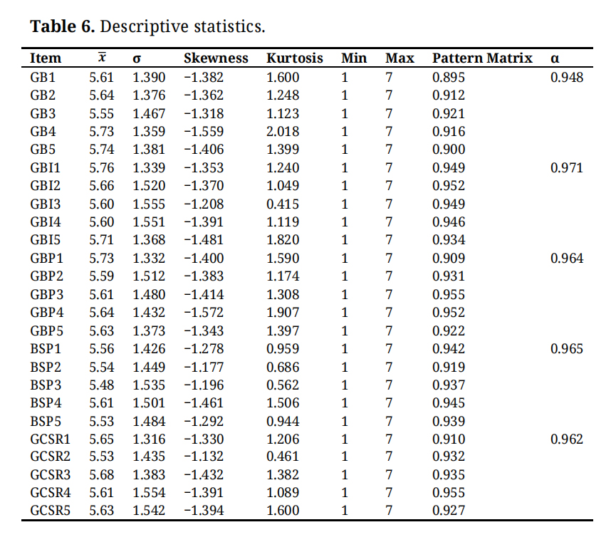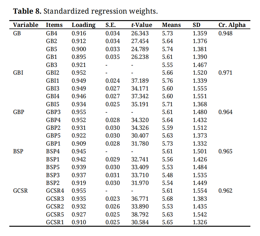 Table 8 presents the standardized regression weights and related statistics for various constructs involved in the study, such as GB, GBI, GCSR, GBP, and BSP. Each construct is measured through multiple items or indicators, with details provided on their factor loadings, standard errors, t-values, means, standard deviations, and internal consistency (Cronbach’s alpha). High factor loadings and t-values (generally above 1.96) indicate that the items reliably and significantly represent their respective constructs. For instance, the items related to GB show very high loadings and t-values, demonstrating they are strong indicators of that construct. The Cronbach’s alpha values are mostly above 0.9, reflecting excellent internal consistency and reliability of the measures. Overall, the table indicates that the measurement model is robust, with well-fitting items that reliably capture the underlying variables, ensuring confidence in the subsequent analysis of relationships among these constructs.