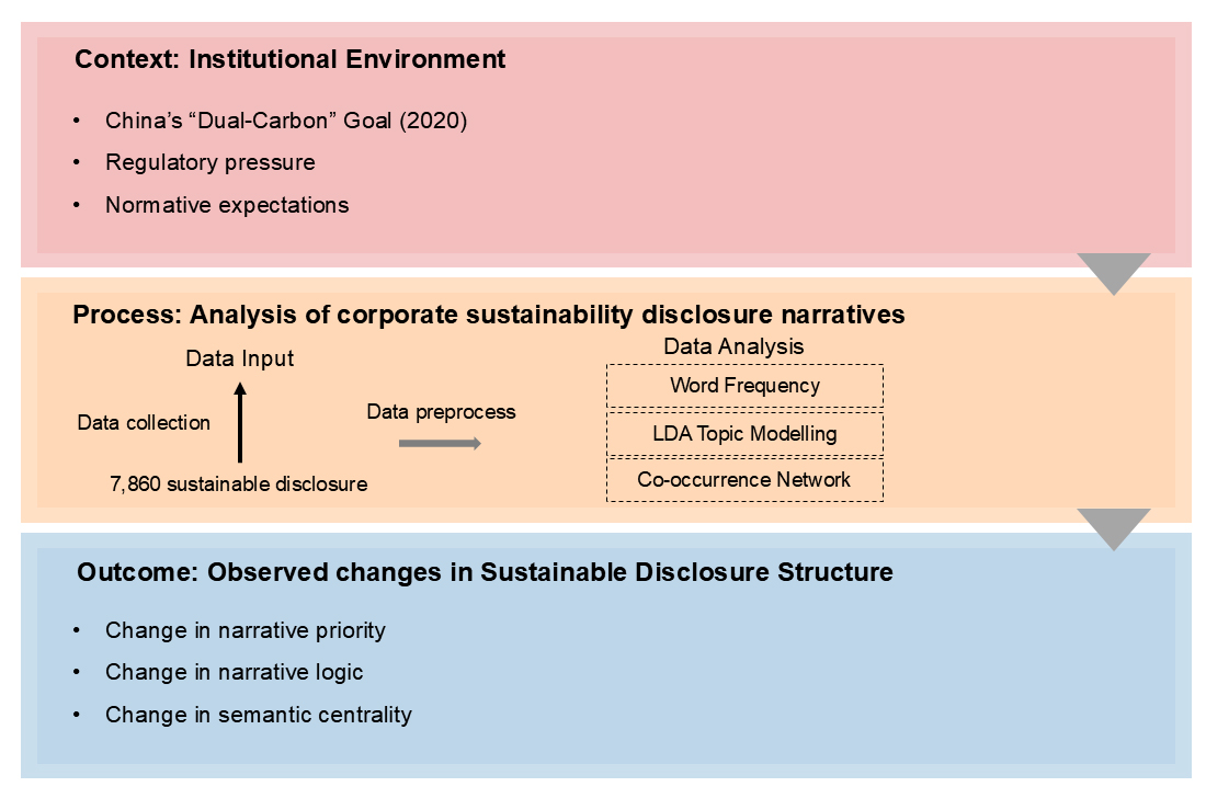To address these research questions within a coherent theoretical and analytical logic, this study develops a conceptual framework grounded in institutional theory, as illustrated in Figure 1. The framework organized in the logic of Context-Process-Outcome illustrates how institutional pressure associated with the “Dual-Carbon” goal is conceptually linked to changes in corporate sustainability disclosure and how this process is investigated through text-based analytical methods.
