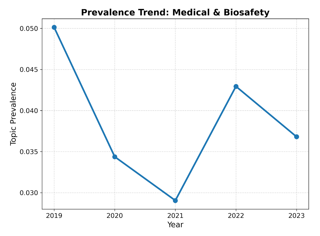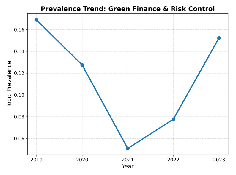 Topic Prevalence and Trend Analysis Beyond identifying the content of each theme, we calculated the Topic Prevalence for each lineage across the five years. Topic prevalence is defined as the expected proportion of a document (or the entire annual corpus) dedicated to a specific topic. By aggregating the prevalence of annual topics belonging to the same semantic lineage, we quantified the shifting "narrative gravity" of different sustainability dimensions. This allows us to systematically examine changes in the relative prominence of different sustainability narrative dimensions in corporate disclosure.