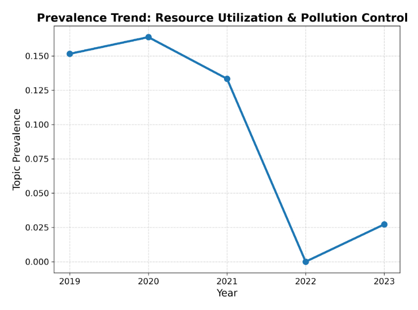This shift is also clearly observed in the LDA topic modeling results. While the thematic lineage Climate & Emission Strategy rose sharply and became the most prominent topic in 2023, Resource Utilization & Pollution Control declined continuously and even lost semantic coherence in 2022. This trend implies a reclassification that pollution-related issues were absorbed into carbon-oriented narratives. Similar transitions have been observed in contexts where climate policy reframes environmental responsibility from operational control to strategic orientation [30].