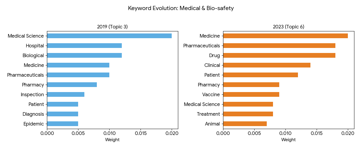 Our primary metric, Document Coverage, is defined as the percentage of total reports in a given year that mention a specific keyword at least once. This metric is chosen over raw word count to effectively normalize for annual variations in sample size and report length. To formally verify the policy's structural impact, a Two-sample Z-test for Proportions was conducted. This test compares the Document Coverage of each keyword in the baseline period (2019) against the post-policy period (2023) to determine if the observed shifts are statistically significant.