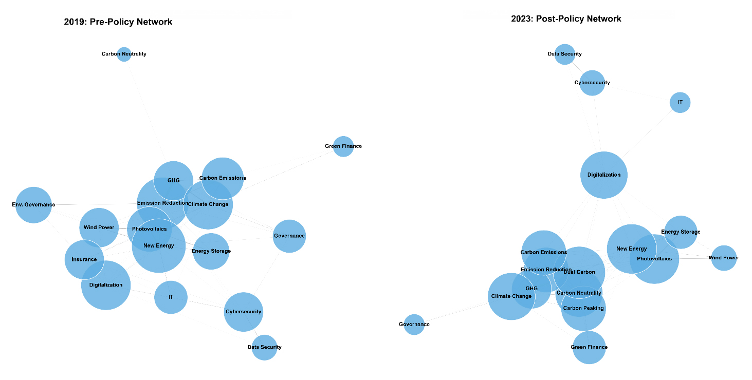 To be clear, this institutional realignment was not just about keyword frequency or document coverage. The LDA results demonstrate that "Climate & Emission Strategy" became the most prominent thematic line, and the co-occurrence network analysis shows that carbon-related concepts became key semantic anchors linking multiple clusters. This indicates that Chinese-listed companies did not merely add new climate-related terms to their existing sustainable disclosures but reorganized their reporting structure around carbon governance as a central strategic focus. Similar shifts have been seen in previous studies examining how major environmental policies influence corporate reporting priorities by redefining what is considered legitimate and relevant disclosure [14].