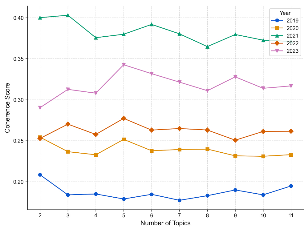 Before topic interpretation, the optimal number of topics for each year was determined using coherence score analysis across a range of K (2 to 11) values (see Figure 3). While lower values of K exhibited slightly higher cross-year stability, K = 7 was selected to balance semantic granularity and interpretability within each year’s sustainable disclosures.