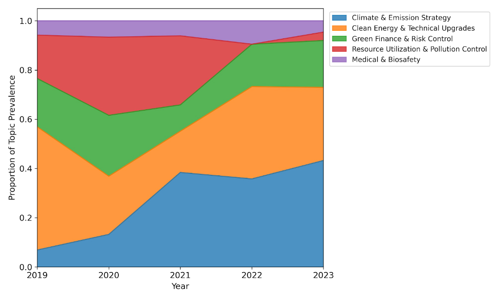 Adopting the optimal topic number k = 7 and individually modeling each year’s sustainable disclosures from 2019 to 2023, a total of 35 latent topics (7 topics per year) was generated. To enhance interpretability and enable cross-year comparison, these topics were categorized based on the semantic similarity of their high probability keywords and dominant thematic content. Consequently, five recurrent thematic lineages were identified, which collectively represent recurring thematic patterns in corporate sustainability narratives in China. These five lineages are: Climate & Emission Strategy, Clean Energy & Technical Upgrades, Green Finance & Risk Control, Resource Utilization & Pollution Control, and Medical & Bio-safety.