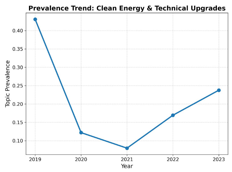 From the perspective of annual prevalence evolution, the “Clean Energy & Technical Upgrades” lineage experienced a significant decline followed by a partial recovery over the study period (see Figure 8). In detail, its topic prevalence decreased from 0.4307 in 2019 to a dramatically lower score of 0.0797 in 2021, but rebounded to 0.2376 in 2023. Overall, this trend reflects a substantial reduction in the relative narrative weight of this lineage compared with its initial prominence in 2019.