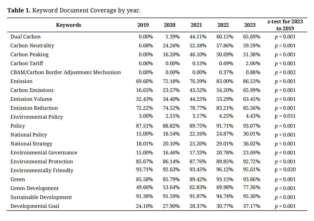 To quantify the change in Chinese-listed companies’ focus on the lexical level, we first selected a matrix of 21 policy-relevant keywords derived from the State Council’s "Action Plan for Carbon Dioxide Peaking Before 2030" and the “1+N” policy framework, covering key dimensions such as policy directives (e.g., Dual Carbon, Carbon Neutrality), action indicators (e.g., Carbon Emissions, Emission Reduction), and generalized sustainability terms (e.g., Green Development). The full of 21 keywords are: “Dual Carbon (双碳)”, “Carbon Neutrality (碳中和)”, “Carbon Peaking (碳达峰)”, “Carbon Tariff(碳关税)”, “CBAM”, “Carbon Border Adjustment Mechanism(碳边境调节机制)”, “Emission(排放)”, “Carbon Emissions(碳排放)”, “Emission Volume(排放量)”, “Emission Reduction (减排)”, "Environmental Policy(环境政策)”, “Policy (政策)”, “National Policy(国家政策),” “National Strategy(国家战略)”, “Environmental Governance(环境治理)”, “Environmental Protection (环境保护)”, “Environmentally Friendly (环保)”, “Green (绿色)”, “Green Development (绿色发展)”, “Sustainable Development(可持续发展)”, and "Developmental Goal(发展目标)".