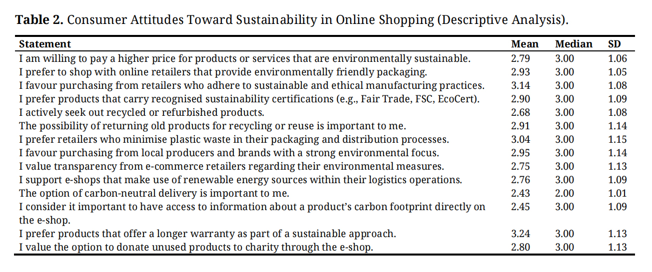 Given that the digital sphere has become the dominant platform for shopping, and its rapid expansion introduces both new business opportunities and environmental risks, examining consumer attitudes towards sustainability in this context is essential. With shoppers increasingly mindful of the ecological impact of their decisions, sustainability is rapidly becoming a key influencer of purchasing choices, customer loyalty, and brand confidence. Understanding consumer attitudes towards eco-friendly packaging, the carbon intensity of shipping, and product origin allows e-commerce companies to better adapt their business models. This ensures their operations reflect consumer values whilst simultaneously supporting the reduction of negative environmental consequences. Consequently, this research provides a significant benefit, not only for global sustainability but also for the commercial viability and enduring success of online sellers.