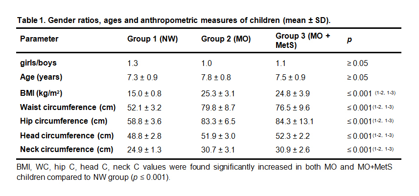 The children aged 5.8-9.5 years were divided into three groups; NW (Group 1, n = 30), MO (Group 2, n = 25) and MO + MetS (Group 3, n = 25). There was no statistically significant difference among the gender ratios as well as mean ages of the groups (p ≥ 0.05). The anthropometric measurements were summarized in Table 1.