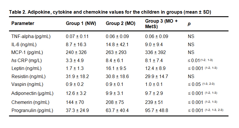 In a study performed on obese children aged 4-12 years, increased leptin and resistin levels were recorded [29]. The development of MetS in children has been informed as a good predictor for T2D development as well as CVDs in adulthood. The increased secretion of IL-6 and TNF-α by enlarged adipose tissue in obesity largely exhibit proinflammatory effects in atherosclerosis pathogenesis [16, 30]. The values did not differ between the groups also for TNF-α and IL-6. However, leptin levels exhibited significant increases in both MO and MO + MetS groups compared to those of NW children (p ≤ 0.001).