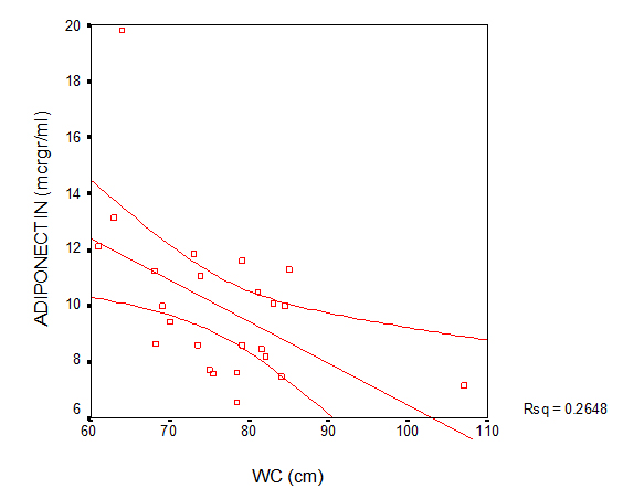 In MO + MetS group, an important and valuable relation, which was not detected in NW as well as MO was found. In this group, WC was negatively correlated with adiponectin (r = -0.515, p = 0.010) (Fig. 2).