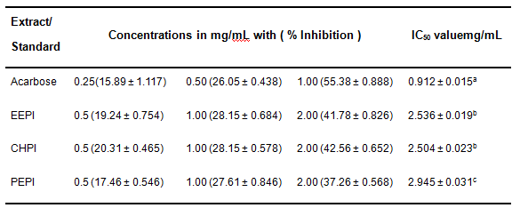 In vitroα-amylase inhibitory action of EEPI, CHPI and PEFI were presented in Table 1. Three of the extracts were found to show very notableα-amylase inhibition. CHPI showed the highest inhibition and it’s IC50was found to be 2.504 ± 0.023 mg/mL which is lower than others and statistically significant (p < 0.001) compared to that of standard antihyperglycemic agent (acarbose) of IC50 0.912 ± 0.015 mg/mL. However, α-amylase inhibitory effects were noted as a dose-dependent phenomenon like Acarbose. The strength of α-amylase inhibitory actions of the extracts were graded as CHPI > EEPI > PEPI.