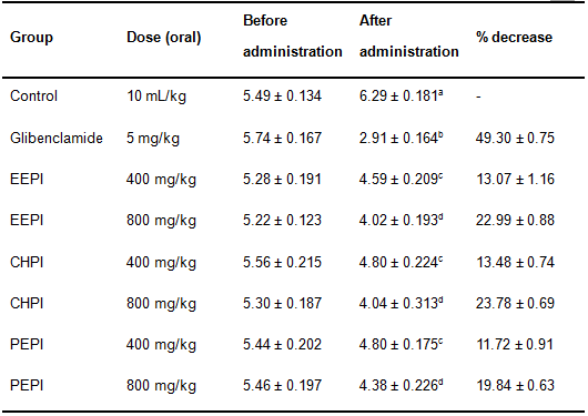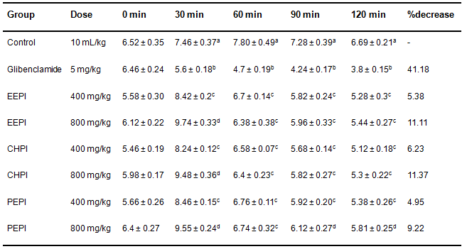 3.3 Hypoglycemic effect in normal miceHypoglycemic effect of the extracts is presented in Table 2. Both the doses of EEPI, CHPI and PEPI showed a reduction of blood glucose statistically significant (p < 0.05-0.001) compared to glibenclamide. These results suggest the similar significance level for hypoglycemic activity of 800 mg/kg extracts and glibenclamide. The dose of 800 mg/kg of CHPI decreased blood glucose level 23.78 % which was higher than other treatments, except standard glibenclamide.