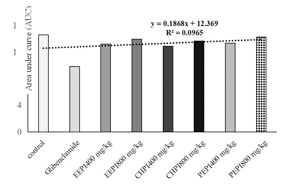 Table 3 describes the oral glucose tolerce data for experimental animals. Induction of hyperglycemia resulted an increased blood glucose level at 30 min of all the treatments and continued till 60 min. Promising reduction of glucose load was recorded for 800 mg/kg of EEPI, CHPI and PEPI at 120 min and their glucose tolerance levels were significant comaperd to (p < 0.05)standard glibenclamide (5 mg/kg). These findings suggest that 800 mg/kg dose is more potent than 400 mg/kg dose. All the data and results of AUC of OGTT are presented in Fig. 1.